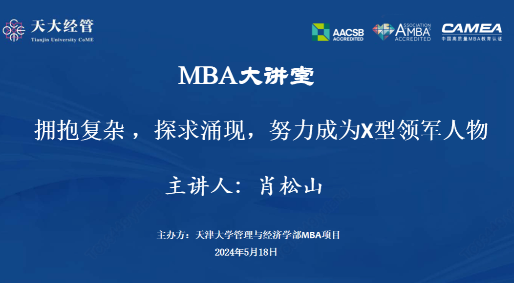 5月18日,由天津大学MBA项目主办的MBA大讲堂之“拥抱复杂,探求涌现,努力成为X型领军人才”主题讲座在深圳国际创新谷6栋B座416报告厅顺利举办。本次大讲堂邀请了天津大学校长助理肖松山进行主题分享,MBA项目近200名师生参加了活动,讲座由MBA项目运营主任张明燕主持。
