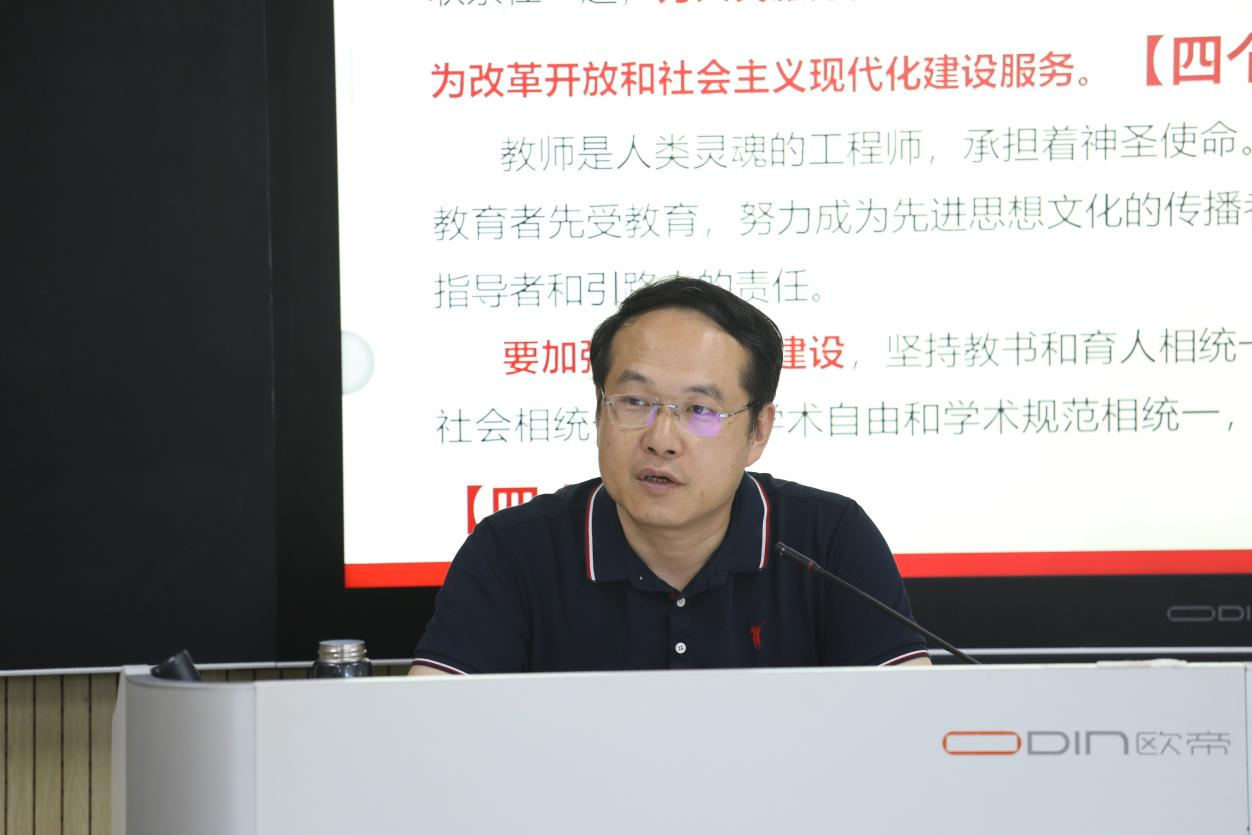 毛照昉从新时代高等教育的初心谈起,围绕当代大学的历史使命、高等教师的行为准则、处理好党建和业务的关系等内容进行深刻阐释。他强调,满足人民日益增长的优质高等教育需求,是当今中国大学的历史责任和使命担当,国将兴,必贵师而重傅,师德师风是评价教师队伍的第一标准,也是落实立德树人根本任务的关键一环。他结合《中国共产党纪律处分条例》和大量典型案例,对新时代高等教师的行为规范进行深刻剖析,带领教师学纪、知纪、明纪、守纪,引导广大教师坚守育人初心,以教育家为榜样,树立“躬耕教坛 强国有我”的志向和抱负,争做“经师”和“人师”相统一的大先生。