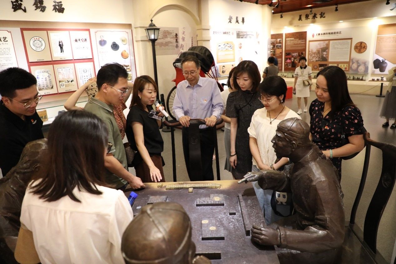 随后,参观和平区非物质文化遗产展览馆,展览以“津味儿”、“工巧”、“百戏”、和“医道”四大板块为主线,展品主要包括狗不理包子、中国古彩戏法、老美华鞋、果仁张、崩豆张等和平区特有的非物质文化遗产,它们见证了历史发展,凝聚了劳动人民的智慧,体现了中华民族优秀的文化生命力和创造力。