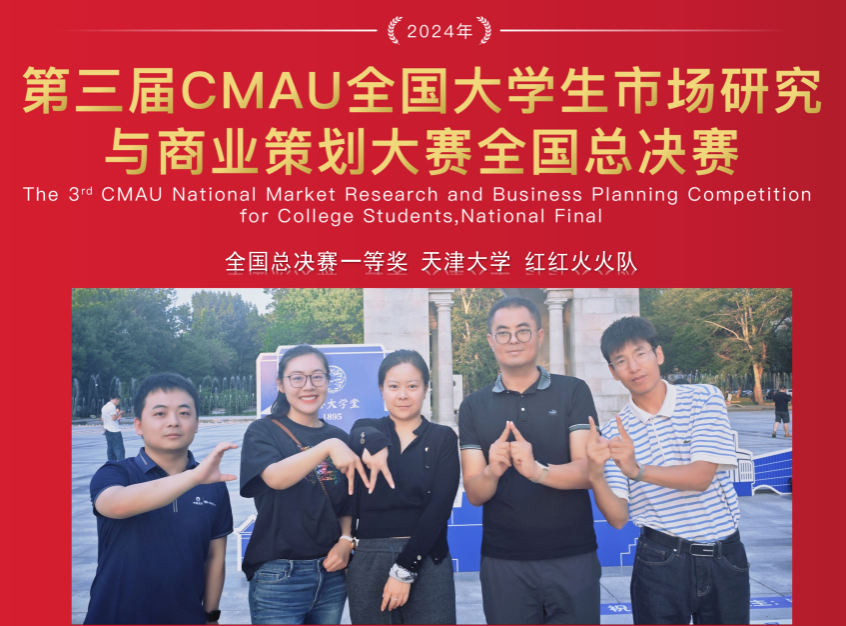 (本站讯 天津大学MBA项目)6月16日,第三届CMAU全国大学生市场研究与商业策划大赛总决赛在湖北武汉圆满落幕。本次大赛共有来自全国超过500所高校、共计2902支团队、32418人报名参赛。天津大学由MBA学生周妍(队长)、张鹏、赵晶晶、闫建虎、田恒瑞组成的“红红火火”队,经过激烈角逐,从113支决赛队伍中脱颖而出,斩获全国一等奖,并创造天津大学在本项赛事的历史最佳成绩。天津大学本科生队伍王玥欣(队长)、刘传蓬、陈佳纯组成的“拉文克劳”队获得全国二等奖。学部李磊教授、马向阳副教授、罗城副教授获得优秀指导教师奖,天津大学获得最佳组织奖。