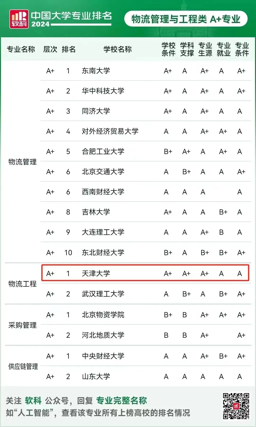 物流工程是对物流服务系统进行设计与优化,以实现低成本、高效益地管理的工程活动。天津大学物流工程专业聚焦智慧供应链与运营管理为特色,依托双一流建设学科“管理科学与工程”,2022年获批国家级一流本科专业, 2023和2024年连续两年荣获软科中国大学专业排名物流工程专业A+第一名。