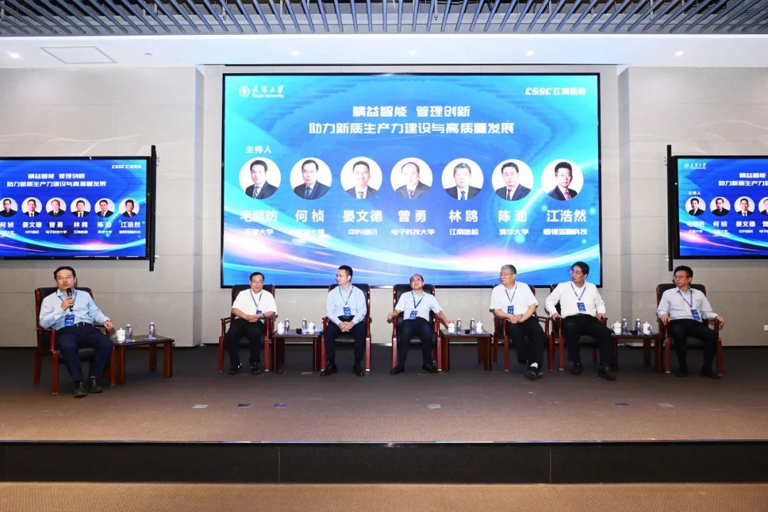 产学界高峰对话环节,产业界代表江南造船党委书记、董事长林鸥,恒银金融科技党委书记、董事长江浩然,中兴通讯副总裁晏文德,以及学术界代表电子科技大学原校长曾勇教授、清华大学陈劲教授、天津大学何桢教授,围绕“精益智能管理创新助力新质生产力建设与高质量发展”主题展开了热烈讨论。产学界高峰对话由毛照昉教授主持。
