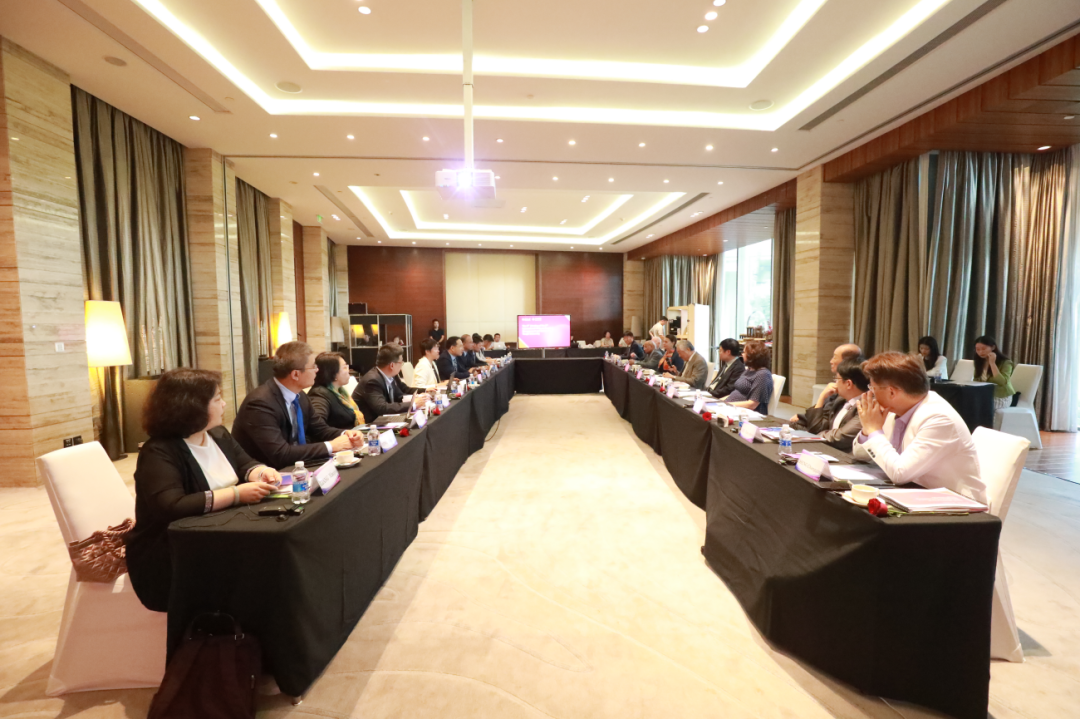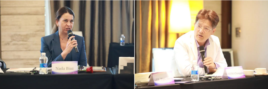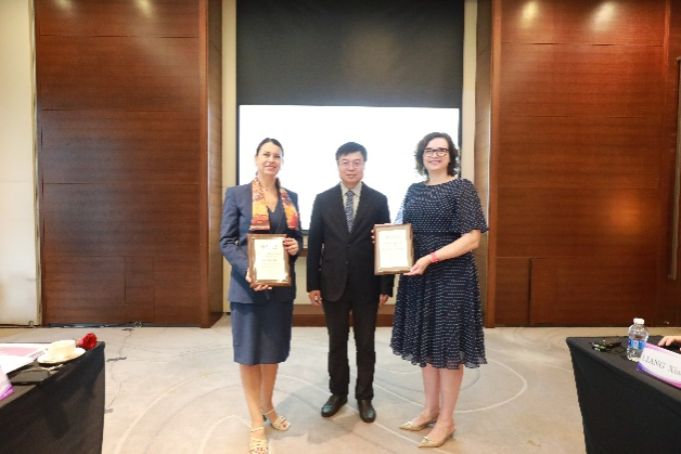 新委员聘任仪式上,金东寒为摩洛哥国立高等行政学院校长Nada Biaz、英国雷丁大学亨利商学院院长Elena Beleska-Spasova颁发聘任证书。
