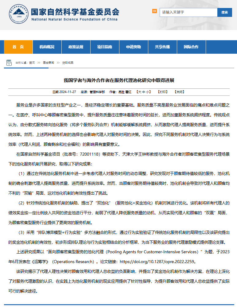 本站讯(通讯员 王钟彬)11月27日,天津大学管理与经济学部系统工程研究所教授王钟彬老师发表于管理科学与运筹学领域顶级期刊Operations Research的关于服务代理池化方面的研究成果《Pooling Agents for Customer-Intensive Services》(点击查看往期报道),被国家自然科学基金委作为代表性资助成果进行展示。