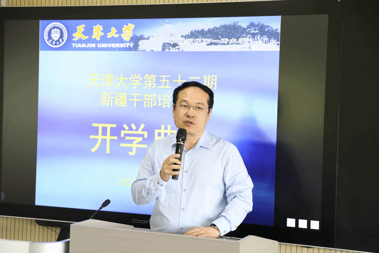 本站讯(通讯员:王维 黎涓)近日,天津大学第52期新疆干部经济管理培训班(以下简称“新疆班”)开学典礼在天津大学卫津路校区25教学楼举办。天津大学党委常委、宣传部长杨欢出席典礼并讲话,天津大学党委组织部副部长康丽琼,天津大学经管学部党委书记毛照昉,学部副主任杨宝臣,新疆班班主任老师马春有、黎涓及全体新疆班学员参加典礼,典礼由学部副主任杨宝臣主持。