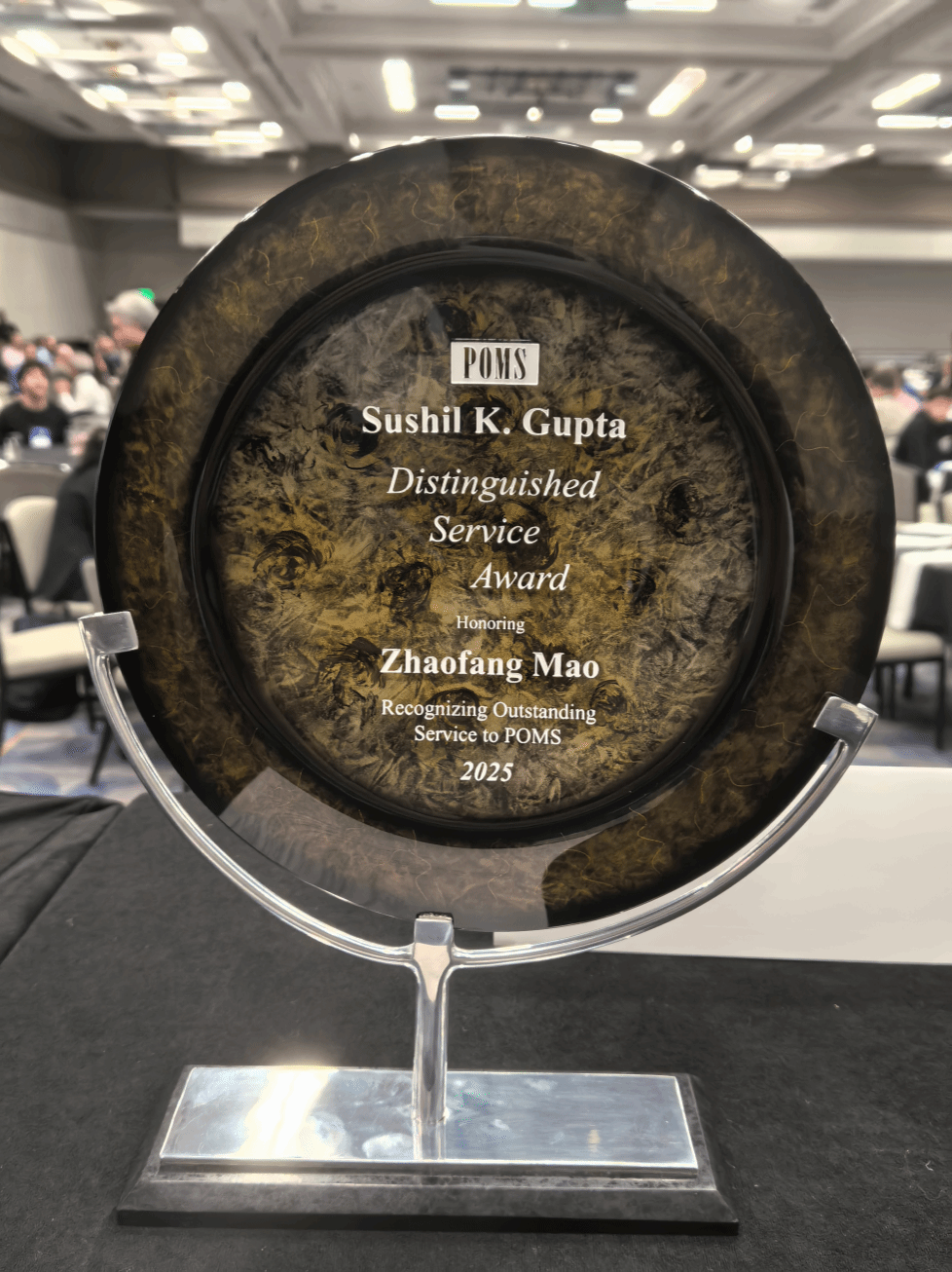 本站讯(通讯员:宇文慧)2025年5月11日,学部党委书记、国际生产与管理学会(POMS)原副主席毛照昉教授在2025年国际生产与管理学会年会上被授予Sushil K. Gupta POMS 杰出服务贡献奖,成为继斯坦福大学Hau Lee教授(2014年)和加州大学洛杉矶分校Christ Tang教授(2017年)之后的第三位华人获奖者,也是该奖项的首位中国高校获奖者。
