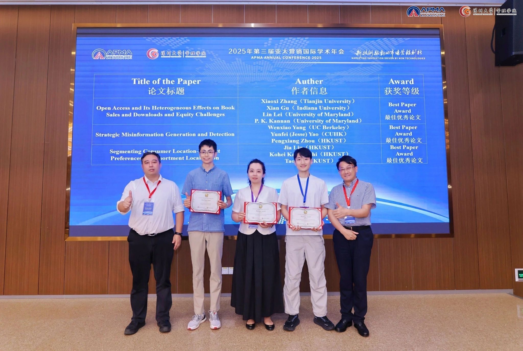 5月24日至25日,第三届亚太营销国际学术年会(APMA)在深圳大学召开。本届会议以“新技术驱动的市场营销创新”为主题,吸引了来自中国、新加坡、澳大利亚等20余个国家和地区的400余名学者参会,围绕数字营销、人工智能应用等前沿议题,通过30余场专题论坛展开深度研讨。天津大学经管学部市场营销系师生团队以1项会议最佳论文奖及3项博士生论坛获奖论文的优异成绩,成为本届会议获奖数量最多的高校之一。