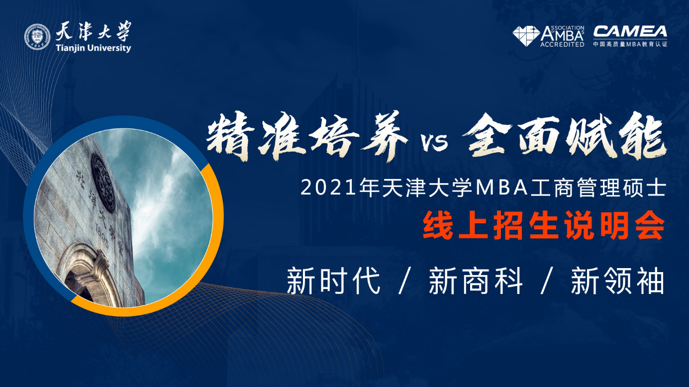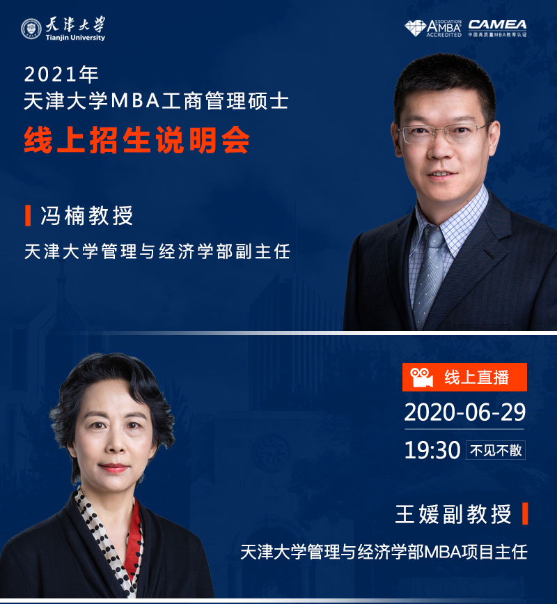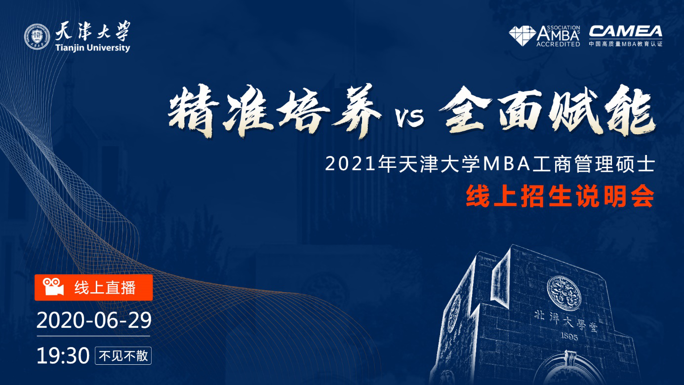 天津大学管理与经济学部MBA项目将于2020年6月29日晚19:30召开首场2021年MBA招生说明会,主要为考生全面介绍学校、学部以及项目发展概况,培养体系,职业发展体系以及2021年MBA招生政策等内容。