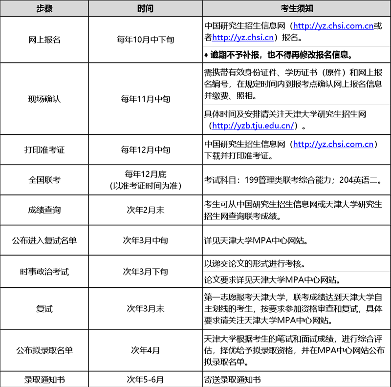 ◆凡报考天津大学MPA的考生必须按规定时间在网上提交报名信息,缴纳报名费,并到指定地点进行现场照相、确认网报信息,不经确认信息者网上报名无效。考生本人对网上报名信息进行核对并确认,经考生确认的报名信息在考试、复试及录取阶段一律不作修改。