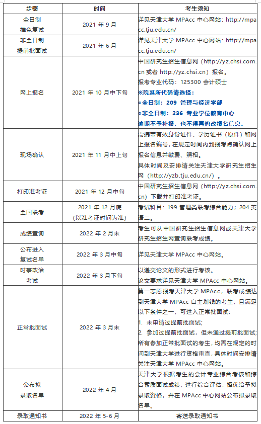 1. 凡报考天津大学MPAcc的考生必须按规定时间在网上提交报名信息,缴纳报名费,并到所在报考点进行现场照相、确认网报信息,不经确认信息者网上报名无效。考生本人对网上报名信息进行核对并确认,经考生确认的报名信息在考试、复试及录取阶段一律不作修改。