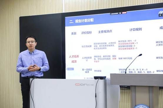 随后,研究生教育办公室赵铭钰就学部近期博士招生的若干重点工作做工作提示,内容涵盖学部2026年学术博士生招生计划分配方案、博士学位论文校盲审负积分扣减博士名额的规定、博士生招生“双限”的规定及学术博士普通招考阶段增加秋季招生批次等。