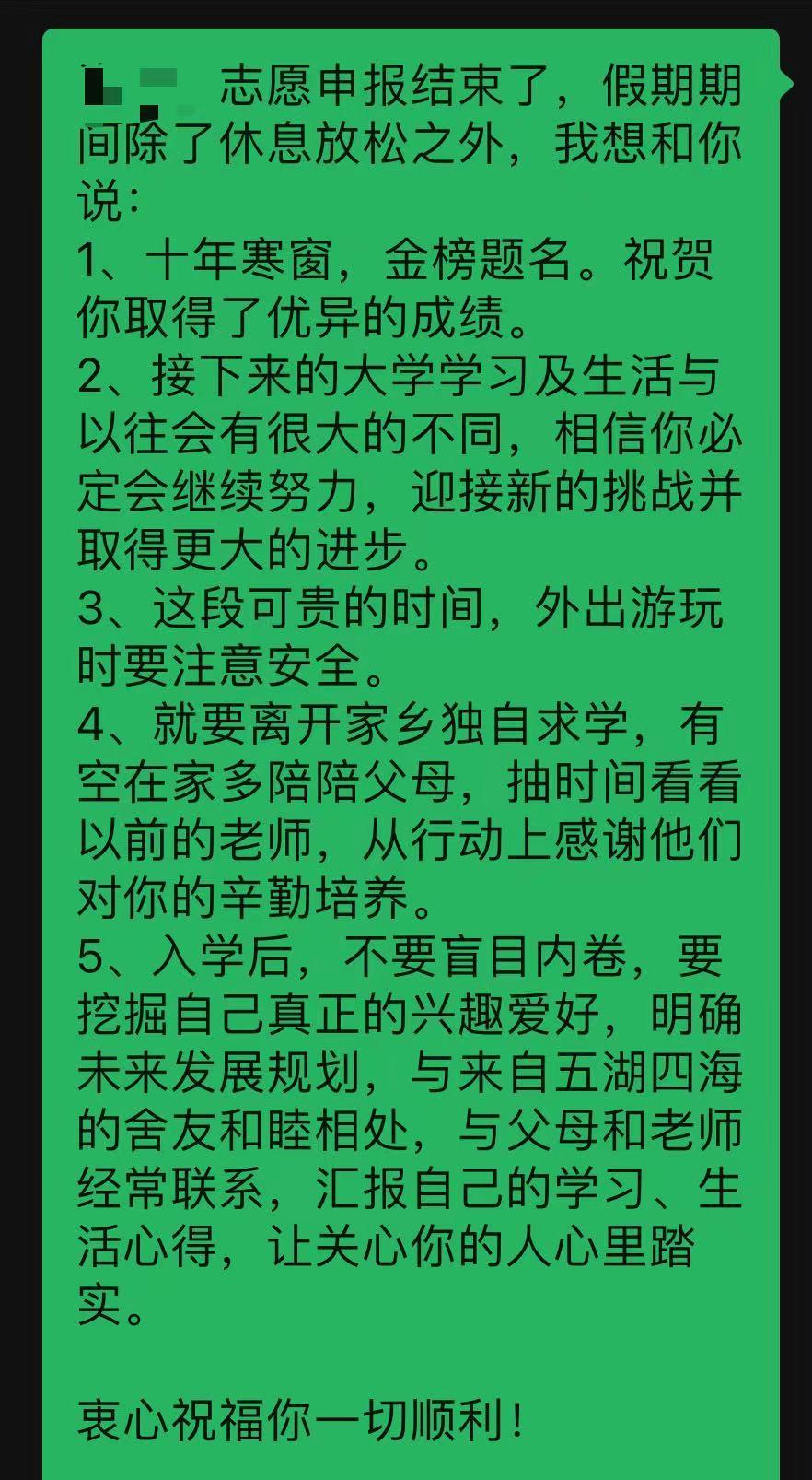 在本次招生收尾阶段,组里的招生老师还给曾经咨询过的考生发了一段长长的暖心寄语,祝贺学生高考取得的优异成绩,叮嘱学生利用假期放松心情,多多陪伴父母,外出游玩注意安全问题,入校后与老师、家长保持联系,迎接大学阶段新的学习和生活。字里行间,洋溢着对学生满满的祝福和关爱,体现了天津大学人文关怀的精神。