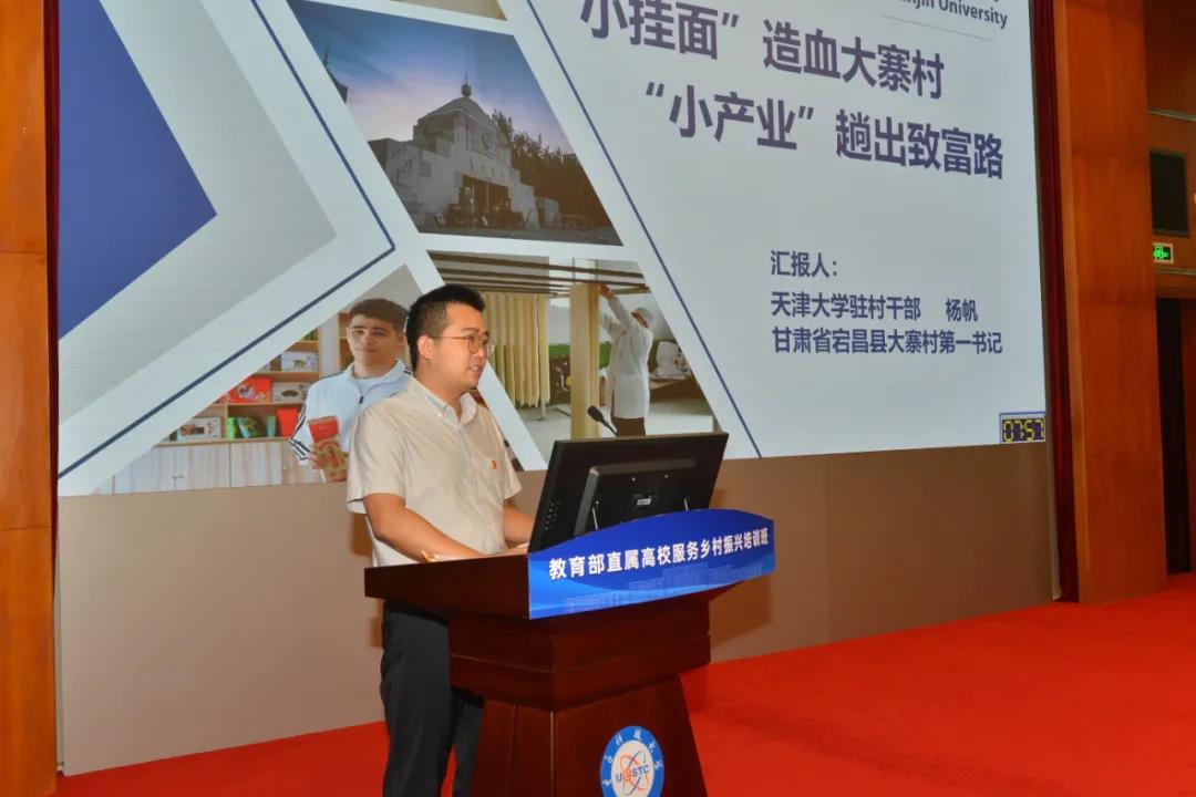 2021年9月15日-16日,在成都举行的第六届教育部直属高校精准帮扶典型项目评选会上,天津大学派驻甘肃省宕昌县大寨村第一书记、经管学部青年教师杨帆代表天津大学做题为“小挂面造血大寨村,小产业趟出致富路”的项目汇报,该项目从75所高校参评项目中脱颖而出,获评第六届直属高校精准帮扶十大典型项目。
