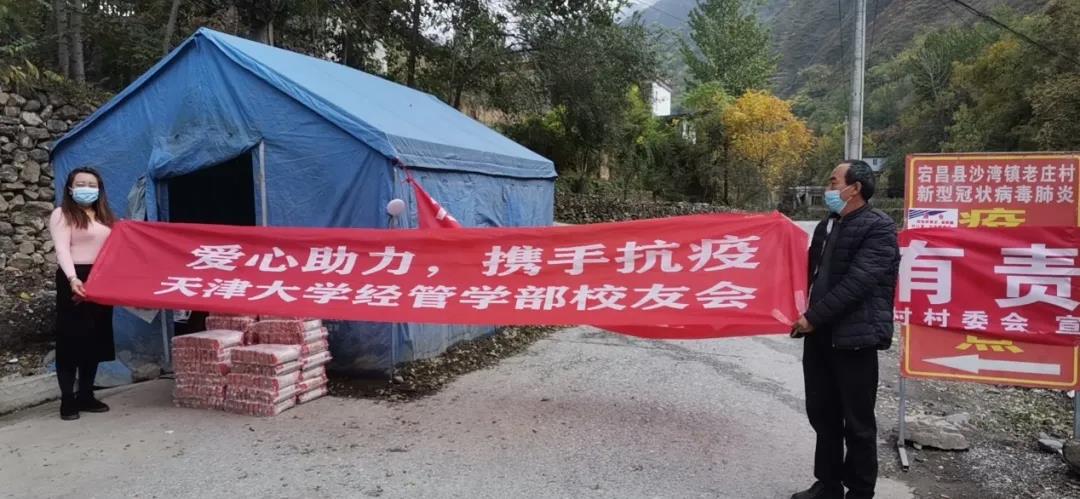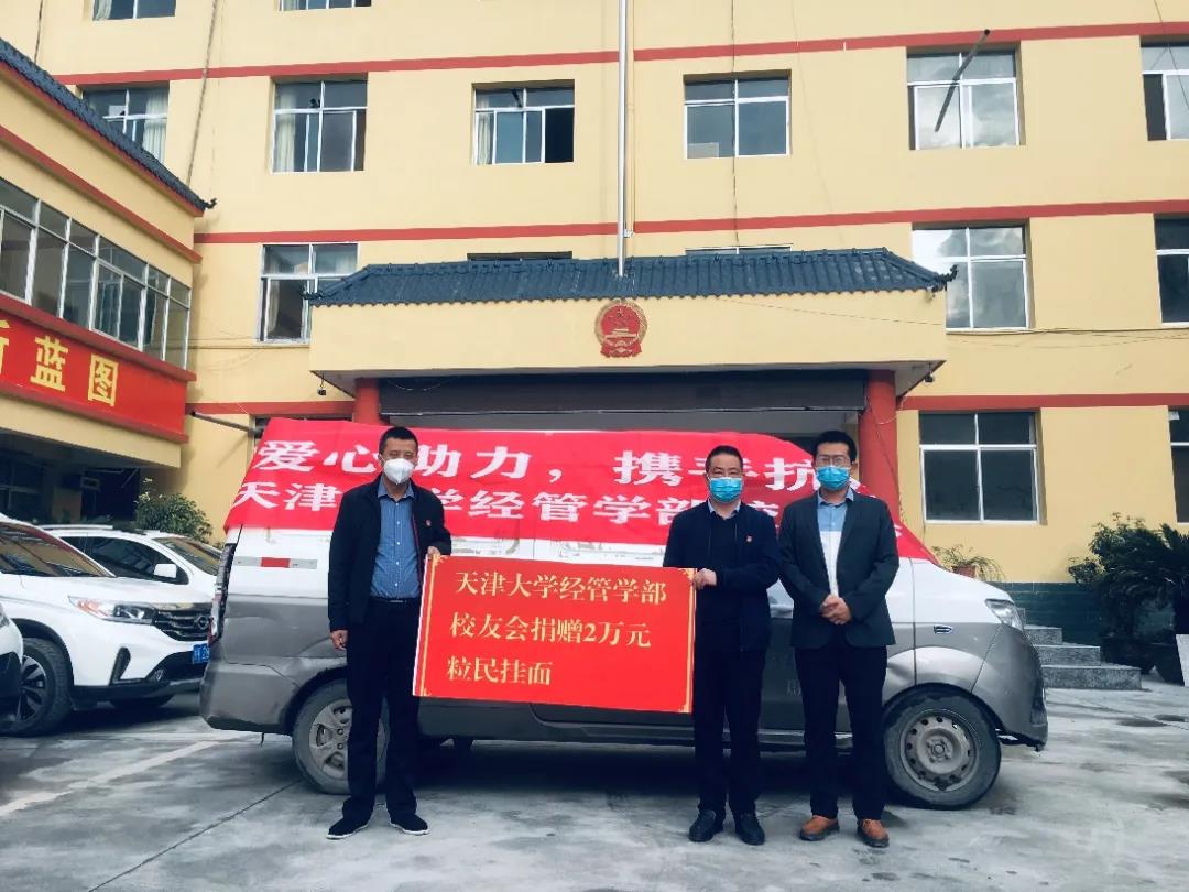 杨帆与沙湾镇党委书记、镇长的合影,收到经管学部校友会捐赠2万元粒民挂面