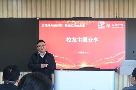 吴明哲结合自身教育背景和工作经验,围绕 “链接” 核心展开 —— 既提及天大经管学部 “链接、赋能、共创、成就” 的 CECA 工作体系,回顾 05 级物流 30 名毕业生多地分布仍通过活动维系的同窗联结,感念赵道致、李波等老师的教诲,也介绍了天大物流工程专业获 2023 软科中国大学专业排名 A + 第一名的成果,以及近年 “智慧链接,共创共享” 系列校友论坛、专业建设二十周年研讨会等活动,最终以感恩师恩、热爱物流的情感,呼吁校友 “常回家看看”,彰显天大物流与供应链对校友、师生的联结与传承。