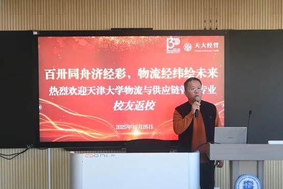 吴明哲结合自身教育背景和工作经验,围绕 “链接” 核心展开 —— 既提及天大经管学部 “链接、赋能、共创、成就” 的 CECA 工作体系,回顾 05 级物流 30 名毕业生多地分布仍通过活动维系的同窗联结,感念赵道致、李波等老师的教诲,也介绍了天大物流工程专业获 2023 软科中国大学专业排名 A + 第一名的成果,以及近年 “智慧链接,共创共享” 系列校友论坛、专业建设二十周年研讨会等活动,最终以感恩师恩、热爱物流的情感,呼吁校友 “常回家看看”,彰显天大物流与供应链对校友、师生的联结与传承。