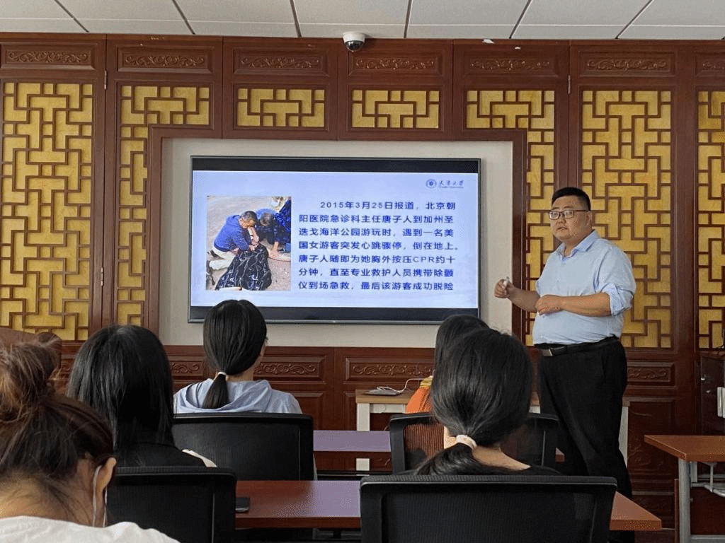 本次培训活动由天津大学应急医学研究院的卢明老师主持分享,分为理论讲解和实践操作两部分。卢明老师在应急医学研究院培训室为师生们开展理论讲解。为了使参与活动的人员了解到心肺复苏培训的必要性,卢老师以各国公共场所心肺复苏成功率与具体案例引入。通过生动形象的案例讲解,师生们充分感受到心脏骤停的频发与心肺复苏术的重要性。