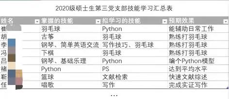 在尊重党员个人意志的基础上,让成员选择自己想要学习的技能,并确定初步的学习方案和目标水平。经统计,本次报名,人均特长1.8个,人均学习技能1.8个,且参与率达100%。