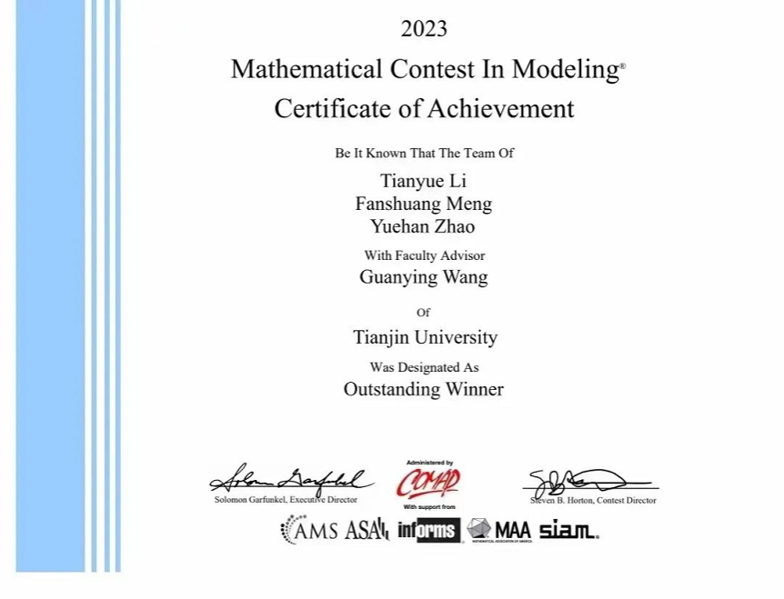 On May 9, the results of the Mathematical Contest in Modeling (MCM/ICM) in 2023 were officially announced. Under the guidance of Associate Professor Wang Guanying from the College of Management and Economics (hereafter called CoME) of Tianjin University (hereafter called TJU), Li Tianyue and Zhao Yuehan, majoring in information management and information system, and Meng Fanshuang, majoring in finance, undergraduate students of the year 2020, won the highest honor (the top 0.15%) of the Outstanding Winner.