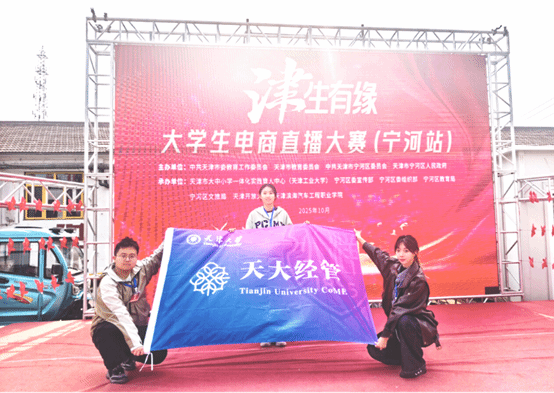 近日,由天津市教育两委联合宁河区委、区政府主办的天津市中小学研学实践展示活动暨“津生有缘”大学生电商直播大赛在宁河区举行。旨在为深入贯彻落实全国教育大会精神,推动研学实践教育高质量发展,提升高等教育服务经济社会发展的能力。由天津大学经管学部思政人才辅导员施雅馨担任指导老师,学部2022级本科生魏子瑜、2025级硕士研究生任玉莹作为队员组成的队伍应邀参与活动。