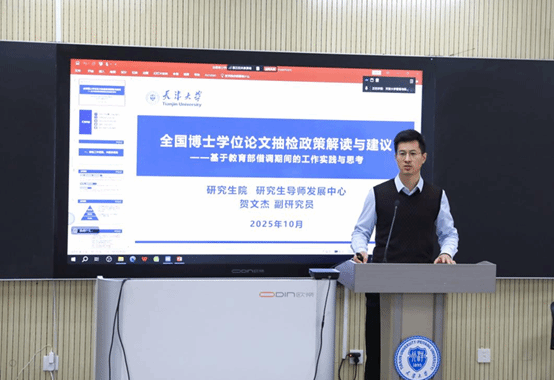为深入学习贯彻习近平总书记给天津大学全体师生重要回信精神,进一步加强研究生导师队伍建设,切实提升导师育人能力与研究生培养质量,2025年10月29日,管理与经济学部在25楼C513会议室成功举办2025年度研究生导师培训会。本次会议以线上线下相结合方式举行,紧扣“学习重要回信精神,提高研究生培养质量”主题,特邀天津大学研究生院副研究员、学术质量保障科科长贺文杰就“全国博士学位论文抽检政策解读与建议”作专题报告。学部60余位研究生导师、青年教师及教务管理人员等参加培训,会议由学部副主任杨宝臣主持。