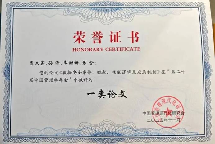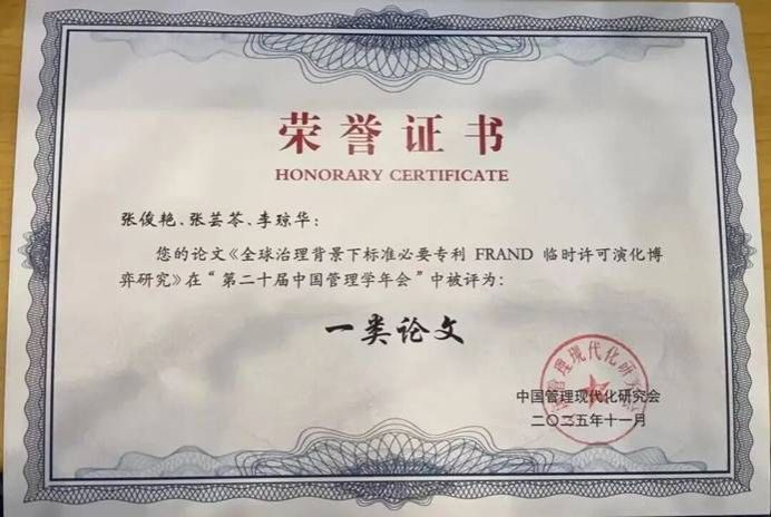 此外,在本届年会优秀论文评选中,知识产权管理专业委员会有两篇论文《全球治理背景下标准必要专利FRAND临时许可演化博弈研究》(作者:张俊艳,张芸苓,李琼华)和《数据安全事件:概念、生成逻辑及应急机制》(作者:曹太鑫,孙涛,李甜甜,张兮)经过专家评审,最终在年会1700余篇投稿文章中脱颖而出,入选第二十届中国管理学年会优秀论文。