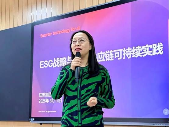 3月13日,联想集团标准与环境事务总监刘薇带来“ESG战略与全球供应链可持续实践”讲座,从ESG顶层设计、全球供应链转型两大层面,结合联想实践拆解企业可持续发展实施路径,让同学们在深化ESG认知的同时,明晰企业出海的转型策略。