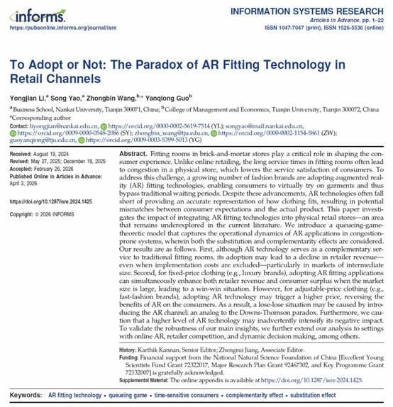 近日,经管学部系统工程研究所王钟彬教授作为通讯作者的论文《To Adopt or Not: The Paradox of AR Fitting Technology in Retail Channels》在信息系统领域的国际顶级期刊Information Systems Research在线发表。
