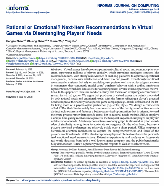 近日,经管学部信息管理与管理科学系赵洪科副教授作为第一作者的论文《Rational or Emotional? Next-item Recommendations in Virtual Games via Disentangling Players’ Needs》在信息系统与计算领域的国际顶级期刊 INFORMS Journal on Computing 在线发表。