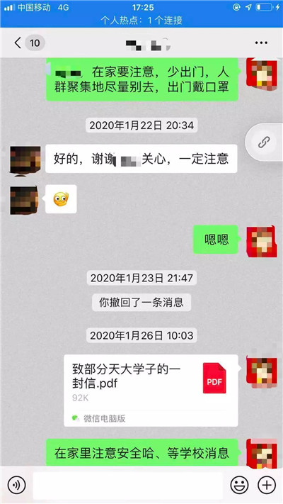 “疫情刚开始,辅导员就让同学们重新更新了寒假去向的信息,这几天也一直不断询问大家的情况。”2019级本科生胡同学每当打开班长群,都是辅导员细心的嘱咐和有关防控的通知。“大家都感受到了学校疫情防控工作效率之高,同学们安心之余也都积极配合。”从最初的通知大家不要提前返校,到延迟开学,这两天提醒大家填写更新个人情况的动态问卷,胡同学都确保每个同学收到通知,也通过寝室长的反馈及时掌握同学们的身体状况。