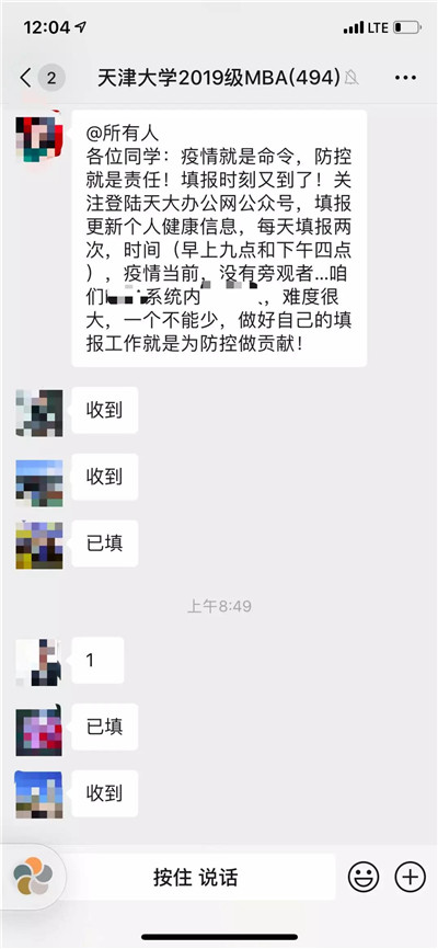 对于各位老师而言,每天早上9:00和下午16:00,成了他们在微信群里叮嘱每一位同学填报更新个人情况的定点工作时间。非全日制学生工作背景复杂,又恰逢假期,更为数据提交和统计增加了难度。