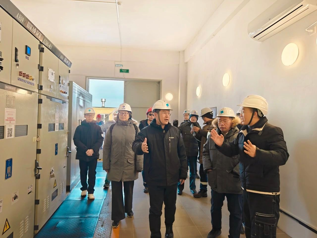 12月18日,代表团前往金风国际(哈萨克斯坦)Shelek风电项目实地调研。Shelek风电场由中国电建集团与哈萨克斯坦Samruk Energy公司共同投资建设,金风科技提供风机设备供货和技术服务。在电建海投项目经理王海峰、金风国际服务经理高江文的陪同下,代表团参观了项目的中控室、风电机组和升压站。