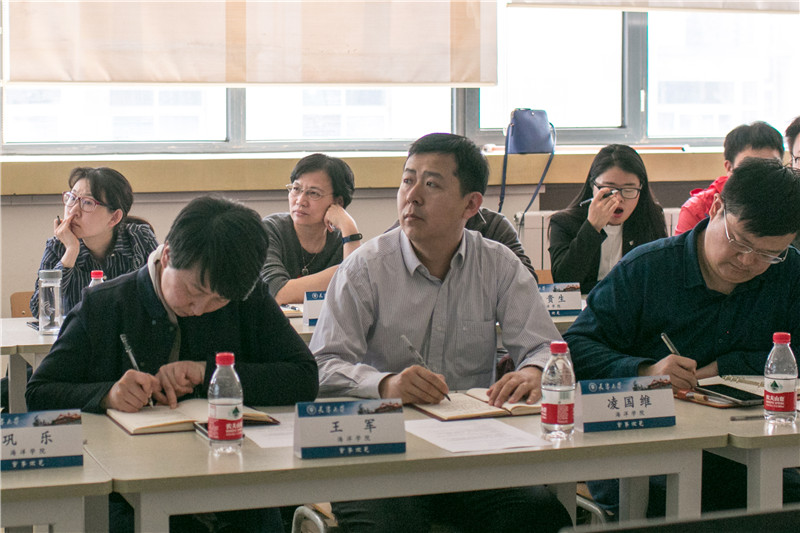 参会的老师们针对课程思政、实践育人以及党建工作等进行了深入的交流。海洋学院魏皓教授、张学峰教授,青年教师薛彬、常帅等,从自己所承担的课程出发,介绍了自己如何将“思政”融入到课程教学中的心得体会。经管学部岳晋萍、高成菊等老师们就对课程思政改革的理解、思政教育与专业课程内容的融合、求实务真精神和敬业精神在专业课程中的融入,引导学生端正思想、扎实理论、帮助学生树立正确的人生观、价值观、世界观,对如何把看似枯燥、难以理解的专业知识变得生动、有活力、有魅力等方面展开了热烈的讨论。