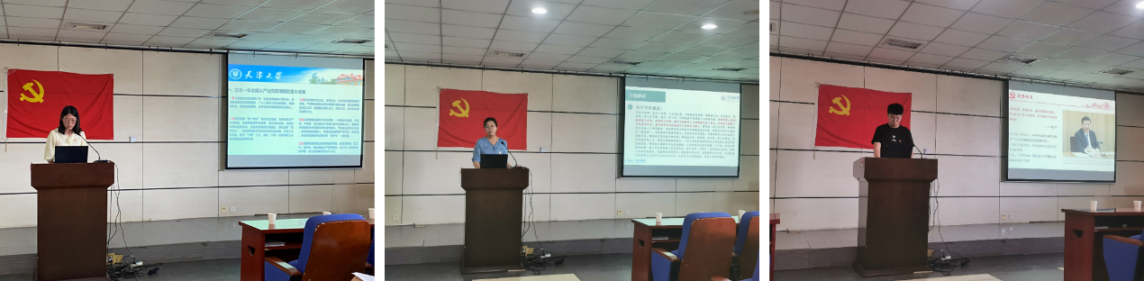 学生党员代表荣睿向师生们分享了支部党课《有一种胜利叫归零——为脱贫攻坚贡献天大力量》,讲述了脱贫攻坚战中的天大身影和天大担当,号召党员同志传承天大的家国情怀,充分发挥模范带头作用。