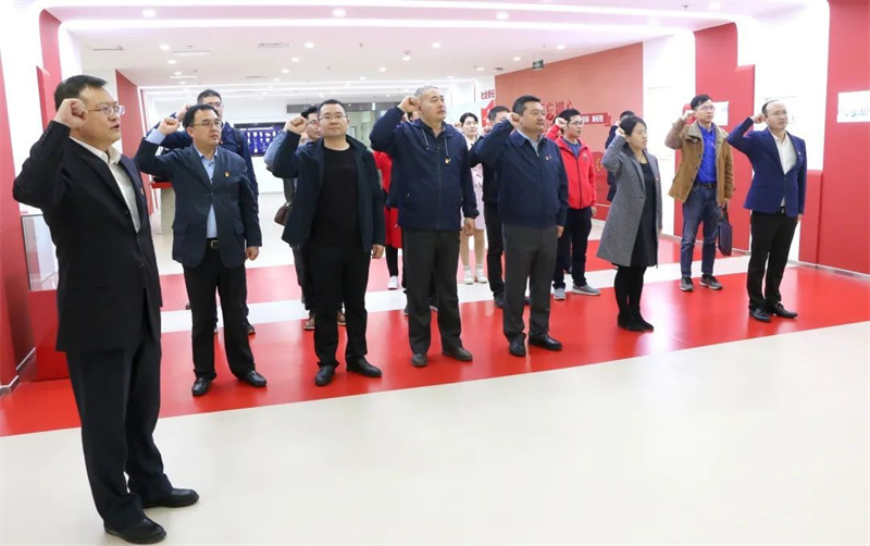 恒银科技党委副书记蒋晗向来访支部党员介绍了公司发展历程以及金融科技产品、智慧金融场景新生态的解决方案,并着重介绍了恒银科技的党建历程和“四融入四助推”党建工作思路,随后带领党员同志们重温入党誓词。