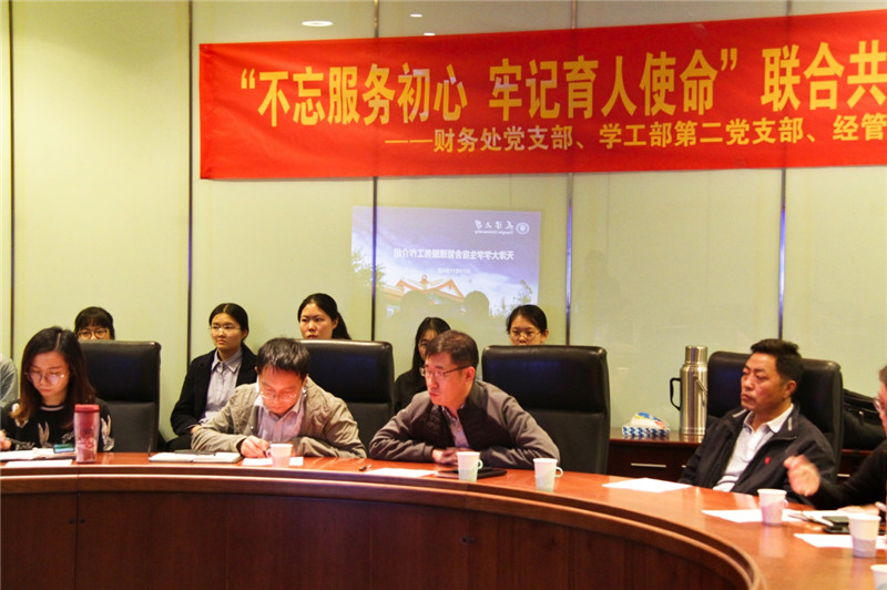 为全面落实开展“不忘初心、牢记使命”专题学习,深入贯彻学习习近平新时代中国特色社会主义思想,提高党员理论水平及政治素养,进一步激励党员干部坚定理想信念,勇担职责,同时也为学生深入了解学工部以及财务处工作,财务处党支部、学工部第二党支部与经管学部2017级本科生党支部于2019年11月6日13:30—15:30,在卫津路校区会议楼六会共同开展“不忘服务初心 牢记育人使命”师生党支部联合共建主题党日活动。