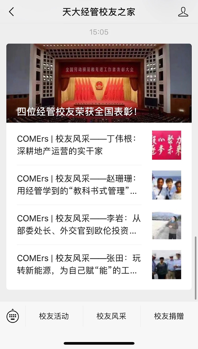 为了打造一方校友的专属天地,丰富校友活动形式,营造温馨校友氛围,及时传递校友讯息,更好展现校友风采,天大经管校友之家公众号正式开通~