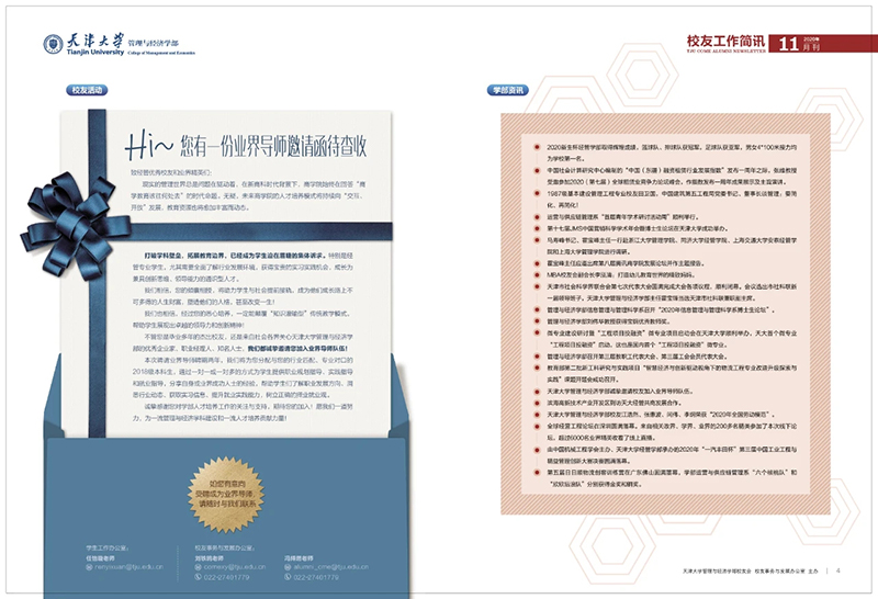我们每月会向您的邮箱中发送一封校友工作简讯,与您分享校友工作的最新进展和学部最新资讯。如果您暂未收到来自校友办的问候,请发送您的个人信息(姓名、联系方式、入学年份、班级、工作单位和职务)到alumni_cme@tju.edu.cn更新邮箱信息。